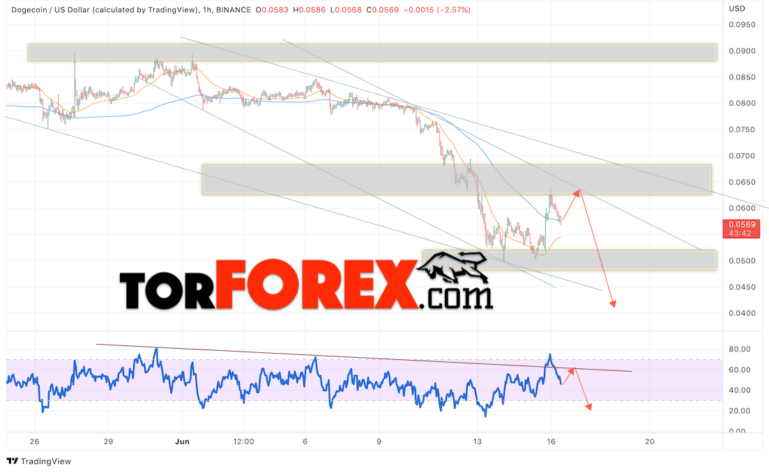 Сильный сигналом в пользу снижения котировок DOGE/USD выступит отскок от линии тренда на индикаторе относительной силы. Вторым сигналом станет отскок от верхней границы нисходящего канала. Отменой варианта падения монеты станет сильный рост стоимости актива и пробой области 0.0745. Это укажет на пробой области сопротивления и продолжение подъёма курса криптовалюты с потенциальной целью выше уровня 0.0975. С пробоем области поддержки и закрытием котировок ниже уровня 0.0435 стоит ожидать подтверждения развития медвежьего импульса по Dogecoin.