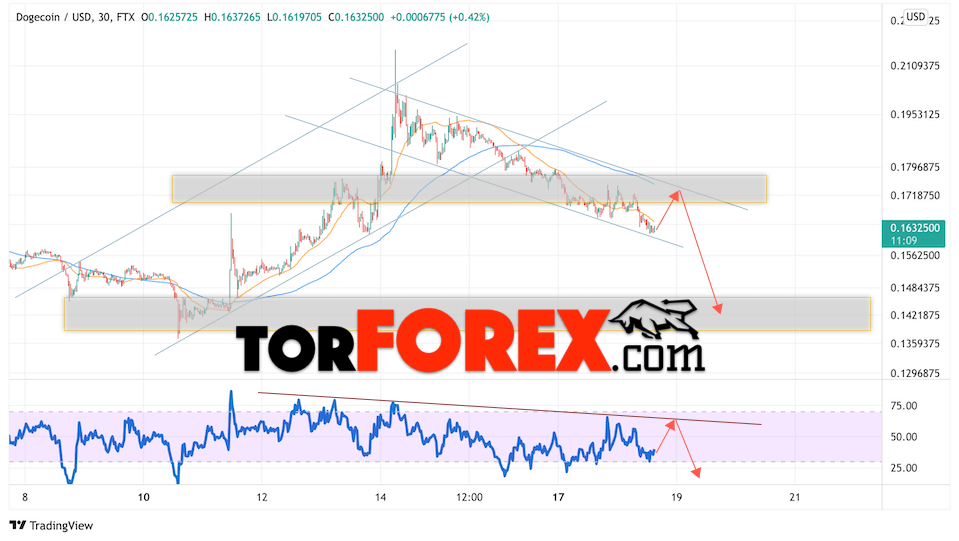 Сильный сигналом в пользу падения котировок DOGE/USD выступит отскок от линии сопротивления на индикаторе относительной силы. Вторым сигналом станет отскок от верхней границы нисходящего канала. Отменой варианта падения монеты станет сильный рост стоимости актива и пробой области 0.1865. Это укажет на пробой области сопротивления и продолжение роста курса криптовалюты с потенциальной целью выше уровня 0.2455. С пробоем области поддержки и закрытием котировок ниже уровня 0.1505 стоит ожидать подтверждения развития медвежьего импульса по Dogecoin.