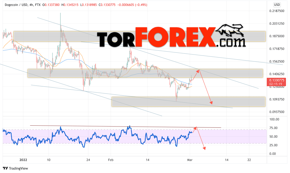 Сильный сигналом в пользу падения котировок DOGE/USD выступит отскок от линии тренда на индикаторе относительной силы. Вторым сигналом станет отскок от верней границы нисходящего канала. Отменой варианта падения монеты станет сильный рост стоимости актива и пробой области 0.1585. Это укажет на пробой области сопротивления и продолжение роста курса криптовалюты с потенциальной целью выше уровня 0.2345. С пробоем области поддержки и закрытием котировок ниже уровня 0.1145 стоит ожидать подтверждения развития медвежьего импульса по Dogecoin.