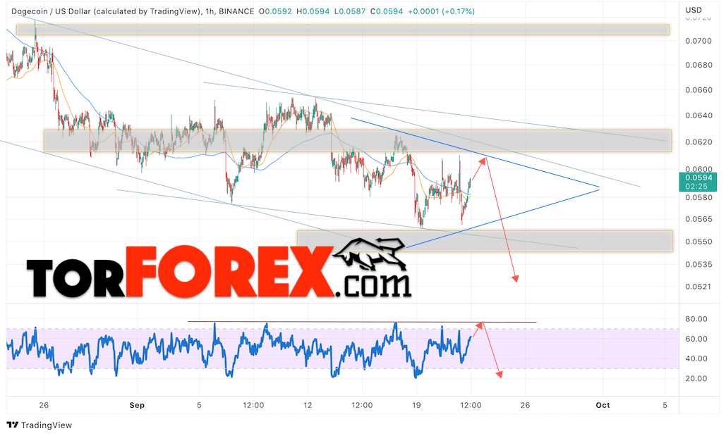 Таким образом, Dogecoin прогноз и курс на 23 сентября 2022 предполагает попытку коррекции и тест области сопротивления вблизи уровня 0.0625. Откуда стоит ожидать отскок и продолжения падения монеты DOGE/USD в область ниже уровня 0.0520. Дополнительным сигналом в пользу снижения Dogecoin выступит тест пробитой линии тренда на индикаторе относительной силы. Отменой варианта снижения станет сильный рост и пробой области 0.0655. Это укажет на продолжение подъёма криптовалюты с целью выше уровня 0.0995.