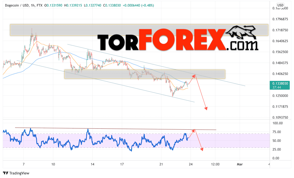 Сильный сигналом в пользу падения котировок DOGE/USD выступит отскок от линии тренда на индикаторе относительной силы. Вторым сигналом станет отскок от верней границы нисходящего канала. Отменой варианта падения монеты станет сильный рост стоимости актива и пробой области 0.1505. Это укажет на пробой области сопротивления и продолжение роста курса криптовалюты с потенциальной целью выше уровня 0.2145. С пробоем области поддержки и закрытием котировок ниже уровня 0.1245 стоит ожидать подтверждения развития медвежьего импульса по Dogecoin.
