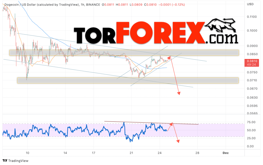 Таким образом, Dogecoin прогноз и курс на 25 ноября 2022 предполагает попытку коррекции и тест области сопротивления вблизи уровня 0.0835. Откуда стоит ожидать отскок и продолжения падения монеты DOGE/USD в область ниже уровня 0.0635. Дополнительным сигналом в пользу снижения Dogecoin выступит тест линии тренда на индикаторе относительной силы. Отменой варианта падения станет сильный рост и пробой области 0.0945. Это укажет на продолжение подъёма криптовалюты с целью выше уровня 0.1335.
