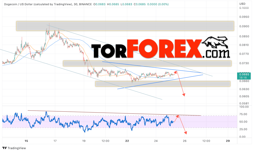 Сильный сигналом в пользу снижения котировок DOGE/USD выступит отскок от линии тренда на индикаторе относительной силы. Вторым сигналом станет отскок от верхней границы модели ”Треугольник”. Отменой варианта снижения монеты станет сильный рост стоимости актива и пробой области 0.0825. Это укажет на пробой области сопротивления и продолжение роста курса криптовалюты с потенциальной целью выше уровня 0.0995. С пробоем области поддержки и закрытием котировок ниже уровня 0.0605 стоит ожидать подтверждения развития нисходящего импульса по Dogecoin, что укажет на пробой нижней границы модели ”Треугольник”.