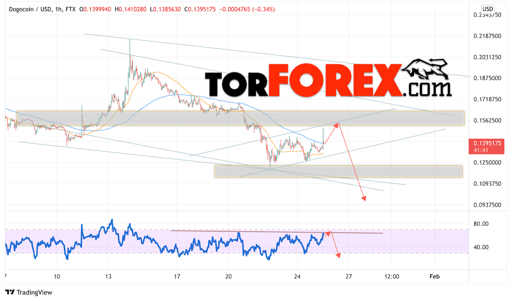 Сильный сигналом в пользу падения котировок DOGE/USD выступит отскок от линии сопротивления на индикаторе относительной силы. Вторым сигналом станет отскок от верхней границы бычьего канала. Отменой варианта падения монеты станет сильный рост стоимости актива и пробой области 0.1705. Это укажет на пробой области сопротивления и продолжение роста курса криптовалюты с потенциальной целью выше уровня 0.2135. С пробоем области поддержки и закрытием котировок ниже уровня 0.1225 стоит ожидать подтверждения развития медвежьего импульса по Dogecoin.