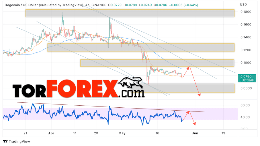 Таким образом, Dogecoin прогноз и курс на 27 мая 2022 предполагает попытку коррекции и тест области сопротивления вблизи уровня 0.0905. Откуда стоит ожидать отскок и продолжения падения монеты DOGE/USD в область ниже уровня 0.0525. Дополнительным сигналом в пользу снижения Dogecoin выступит тест линии тренда на индикаторе относительной силы. Отменой варианта снижения станет сильный рост и пробой области 0.1195. Это укажет на продолжение подъёма криптовалюты с целью выше уровня 0.1495.