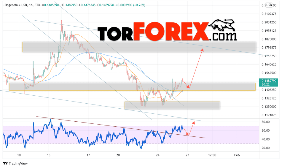 Таким образом, Dogecoin прогноз и курс на 27 января 2022 предполагает попытку коррекции и тест области поддержки вблизи уровня 0.1405. Откуда стоит ожидать отскок и продолжения роста DOGE/USD в область выше уровня 0.1795. Дополнительным сигналом в пользу подъёма Dogecoin выступит тест линии тренда на индикаторе относительной силы. Отменой варианта роста станет падение и пробой области 0.1205. Это укажет на продолжение падения криптовалюты с целью ниже уровня 0.0905.