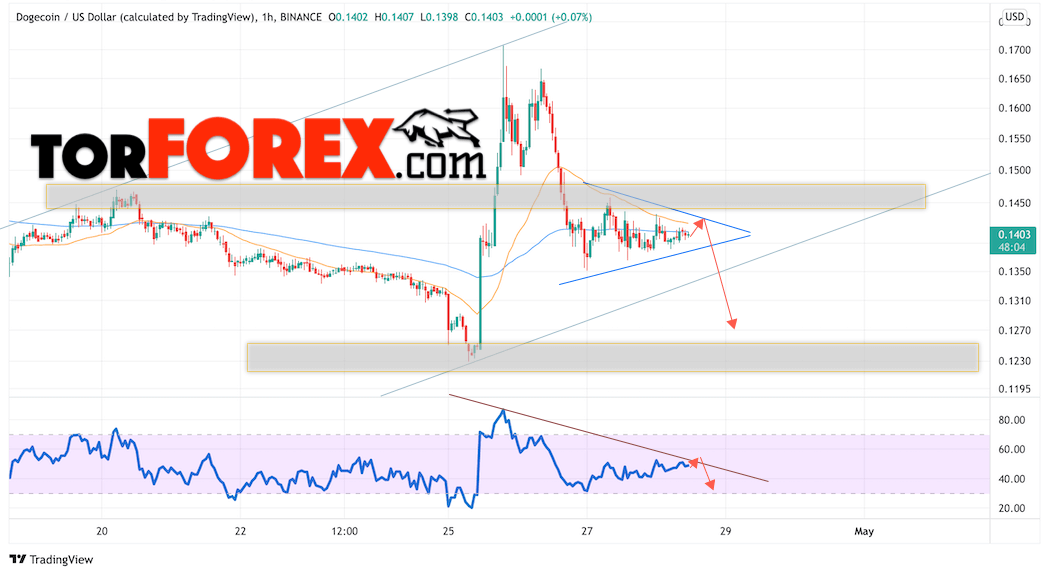 Сильный сигналом в пользу снижения котировок DOGE/USD выступит отскок от линии тренда на индикаторе относительной силы. Вторым сигналом станет отскок от верхней границы модели ”Треугольник”. Отменой варианта падения монеты станет сильный рост стоимости актива и пробой области 0.1565. Это укажет на пробой области сопротивления и продолжение подъёма курса криптовалюты с потенциальной целью выше уровня 0.2005. С пробоем области поддержки и закрытием котировок ниже уровня 0.1275 стоит ожидать подтверждения развития медвежьего импульса по Dogecoin.
