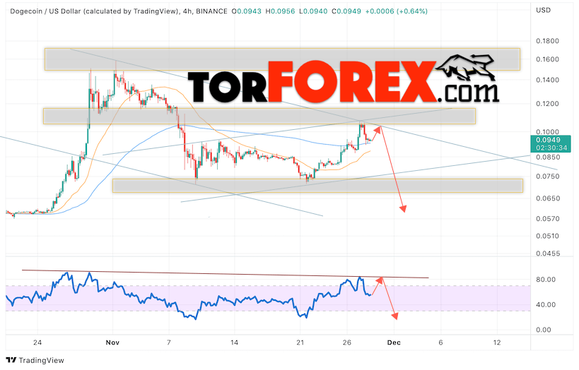 Таким образом, Dogecoin прогноз и курс на 29 ноября 2022 предполагает попытку коррекции и тест области сопротивления вблизи уровня 0.1005. Откуда стоит ожидать отскок и продолжения падения монеты DOGE/USD в область ниже уровня 0.0575. Дополнительным сигналом в пользу снижения Dogecoin выступит тест линии тренда на индикаторе относительной силы. Отменой варианта падения станет сильный рост и пробой области 0.1145. Это укажет на продолжение подъёма криптовалюты с целью выше уровня 0.1385.