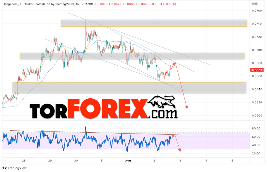 Сильный сигналом в пользу снижения котировок DOGE/USD выступит отскок от линии тренда на индикаторе относительной силы. Вторым сигналом станет отскок от верхней границы нисходящего канала. Отменой варианта падения монеты станет сильный рост стоимости актива и пробой области 0.0765. Это укажет на пробой области сопротивления и продолжение подъёма курса криптовалюты с потенциальной целью выше уровня 0.1105. С пробоем области поддержки и закрытием котировок ниже уровня 0.0625 стоит ожидать подтверждения развития медвежьего импульса по Dogecoin.