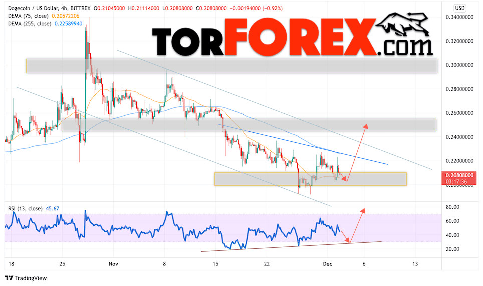 Сильный сигналом в пользу подъёма котировок DOGE/USD выступит отскок от линии поддержки на индикаторе относительной силы. Вторым сигналом станет отскок от нижней границы разворотной модели ”Голова и плечи”. Отменой варианта подъёма монеты станет падение стоимости актива и пробой области 0.1705. Это укажет на пробой области поддержки и продолжение падения курса криптовалюты с потенциальной целью ниже уровня 0.1435. С пробоем области сопротивления и закрытием котировок выше уровня 0.2485 стоит ожидать подтверждения развития бычьей тенденции по Dogecoin.