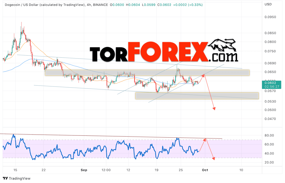 Сильный сигналом в пользу снижения котировок DOGE/USD выступит отскок от медвежьей линии тренда на индикаторе относительной силы. Вторым сигналом станет отскок от нижней границы бычьего канала. Отменой варианта снижения монеты станет сильный рост стоимости актива и пробой области 0.0705. Это укажет на пробой области сопротивления и продолжение роста курса криптовалюты с потенциальной целью выше уровня 0.0945. С пробоем области поддержки и закрытием котировок ниже уровня 0.0485 стоит ожидать подтверждения развития нисходящего импульса по Dogecoin, что укажет на пробой нижней гардины нисходящего канала.