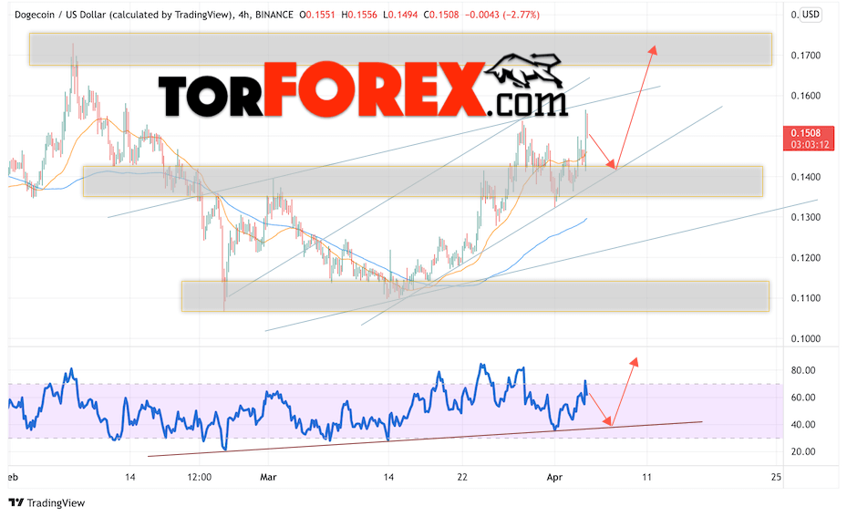Сильный сигналом в пользу роста котировок DOGE/USD выступит отскок от линии тренда на индикаторе относительной силы. Вторым сигналом станет отскок от нижней границы бычьего канала. Отменой варианта подъёма монеты станет падение стоимости актива и пробой области 0.1305. Это укажет на пробой области поддержки и продолжение падения курса криптовалюты с потенциальной целью ниже уровня 0.1025. С пробоем области сопротивления и закрытием котировок выше уровня 0.1655 стоит ожидать подтверждения развития бычьего импульса по Dogecoin.