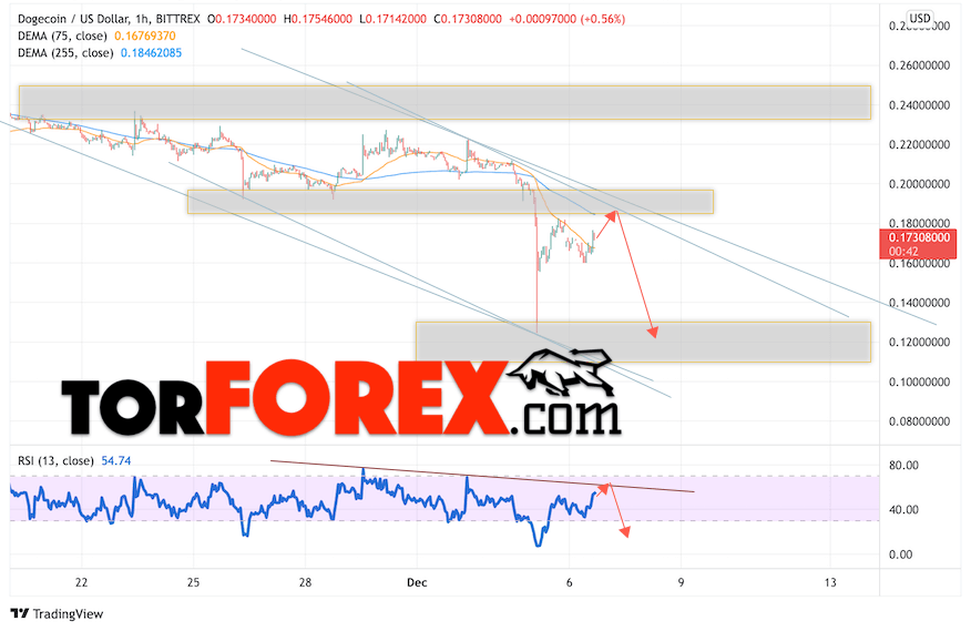 Таким образом, Dogecoin прогноз и курс на 7 декабря 2021 предполагает попытку коррекции и тест области сопротивления вблизи уровня 0.1805. Откуда стоит ожидать отскок и продолжения падения DOGE/USD в область ниже уровня 0.1285. Дополнительным сигналом в пользу снижения Dogecoin выступит тест линии тренда на индикаторе относительной силы. Отменой варианта падения станет сильный рост и пробой области 0.2255. Это укажет на продолжение подъёма криптовалюты с целью выше уровня 0.2955.