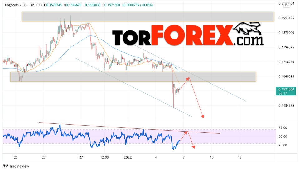 Таким образом, Dogecoin прогноз и курс на 7 января 2022 предполагает попытку коррекции и тест области сопротивления вблизи уровня 0.1645. Откуда стоит ожидать отскок и продолжения падения DOGE/USD в область ниже уровня 0.1285. Дополнительным сигналом в пользу снижения Dogecoin выступит тест линии тренда на индикаторе относительной силы. Отменой варианта падения станет сильный рост и пробой области 0.1785. Это укажет на продолжение подъёма криптовалюты с целью выше уровня 0.2255.