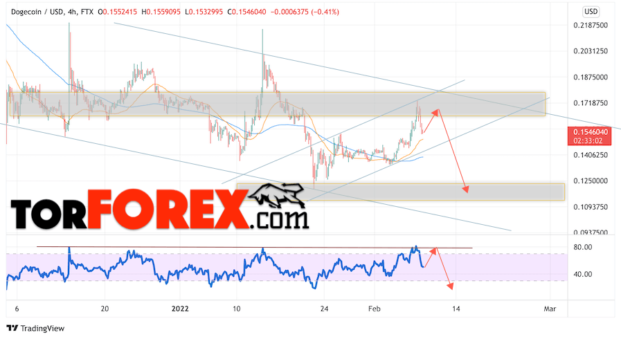 Сильный сигналом в пользу падения котировок DOGE/USD выступит отскок от линии сопротивления на индикаторе относительной силы. Вторым сигналом станет отскок от верхней границы нисходящего канала. Отменой варианта падения монеты станет сильный рост стоимости актива и пробой области 0.1925. Это укажет на пробой области сопротивления и продолжение роста курса криптовалюты с потенциальной целью выше уровня 0.2345. С пробоем области поддержки и закрытием котировок ниже уровня 0.1345 стоит ожидать подтверждения развития нисходящего импульса по Dogecoin.
