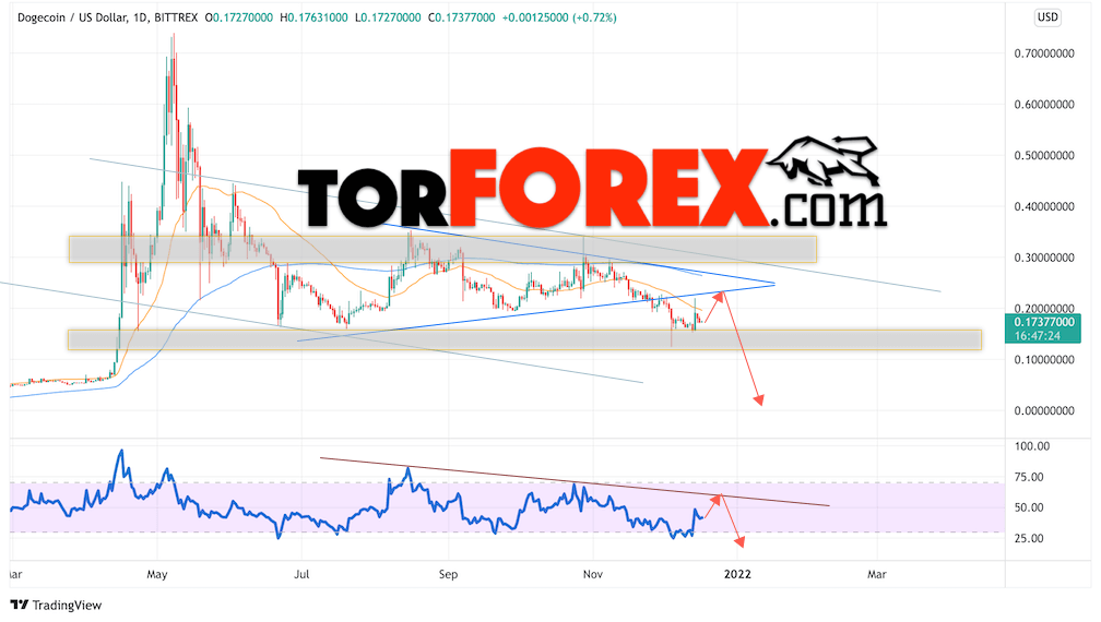 Таким образом, Dogecoin прогноз на 20 — 24 декабря 2021 предполагает попытку теста области сопротивления вблизи уровня 0.2135. Затем продолжение падения в область ниже уровня 0.0505. Дополнительным сигналом в пользу снижения Dogecoin выступит тест линии тренда на индикаторе относительной силы. Отменой варианта снижения станет сильный рост и пробой области 0.3105. Это укажет на продолжение подъёма криптовалюты с целью выше уровня 0.3955.