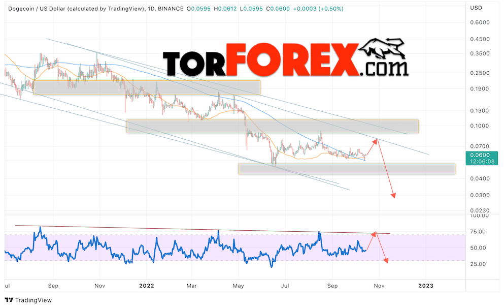 Дополнительным сигналом в пользу падения котировок DOGE/USD на текущей торговой неделе 10 — 14 октября 2022 выступит тест нисходящей линии тренда на индикаторе относительной силы (RSI). Вторым сигналом станет отскок от верхней границы нисходящего канала. Отменой варианта падения криптовалюты Dogecoin на следующей торговой неделе станет сильный рост цены и пробой области 0.1235. Это укажет на пробой области сопротивления и продолжение роста котировок DOGE/USD с целью выше уровня 0.1725. Подтверждением падению криптовалюты выступит пробой области поддержки и закрытие котировок ниже уровня 0.0495.