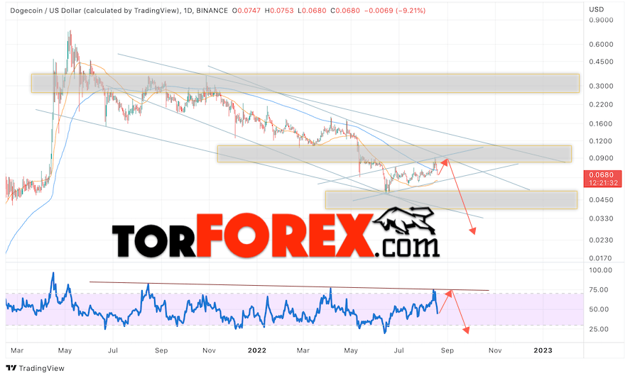 Дополнительным сигналом в пользу падения котировок DOGE/USD на текущей торговой неделе 22 — 26 августа 2022 выступит тест нисходящей линии тренда на индикаторе относительной силы (RSI). Вторым сигналом станет отскок от верхней границы нисходящего канала. Отменой варианта падения криптовалюты Dogecoin на следующей торговой неделе станет сильный рост и пробой области 0.1295. Это укажет на пробой области сопротивления и продолжение роста котировок DOGE/USD с целью выше уровня 0.2045. Подтверждением падению криптовалюты выступит пробой области поддержки и закрытие котировок ниже уровня 0.0565, что укажет на пробой нижней границы бычьего канала коррекции.