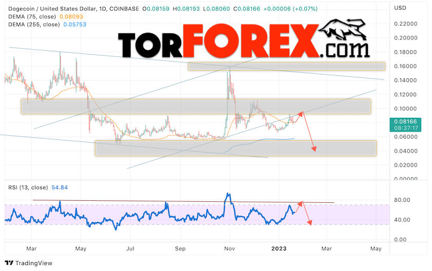 Дополнительным сигналом в пользу падения котировок DOGE/USD на текущей торговой неделе 23 — 27 января 2023 выступит тест нисходящей линии тренда на индикаторе относительной силы (RSI). Вторым сигналом станет отскок от нижней границы бычьего канала, который был пробит продавцами вниз. Отменой варианта снижения криптовалюты Dogecoin на следующей торговой неделе станет сильный рост цены и пробой области 0.1305. Это укажет на пробой области сопротивления и продолжение роста котировок DOGE/USD с целью выше уровня 0.2045. Подтверждением падению криптовалюты выступит пробой области поддержки и закрытие котировок ниже уровня 0.0605.