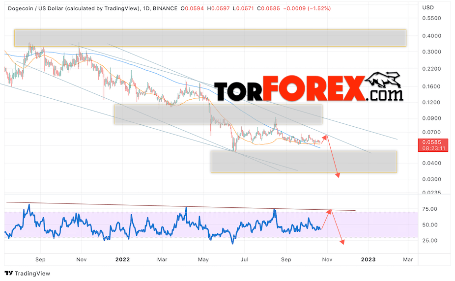 Дополнительным сигналом в пользу падения котировок DOGE/USD на текущей торговой неделе 24 — 28 октября 2022 выступит тест нисходящей линии тренда на индикаторе относительной силы (RSI). Вторым сигналом станет отскок от верхней границы нисходящего канала. Отменой варианта падения криптовалюты Dogecoin на следующей торговой неделе станет сильный рост цены и пробой области 0.1005. Это укажет на пробой области сопротивления и продолжение роста котировок DOGE/USD с целью выше уровня 0.1465. Подтверждением падению криптовалюты выступит пробой области поддержки и закрытие котировок ниже уровня 0.0465.