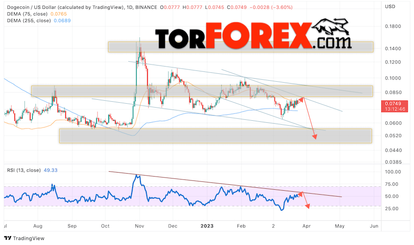 Таким образом, Dogecoin прогноз на неделю 27 — 31 марта 2023 предполагает попытку теста области сопротивления вблизи уровня 0.0805. Затем продолжение падения в область ниже уровня 0.0485. Дополнительным сигналом в пользу снижения Dogecoin выступит тест линии тренда на индикаторе относительной силы. Отменой варианта падения станет сильный рост цен и пробой области 0.1055. Это укажет на продолжение подъёма криптовалюты с целью выше уровня 0.1495.
