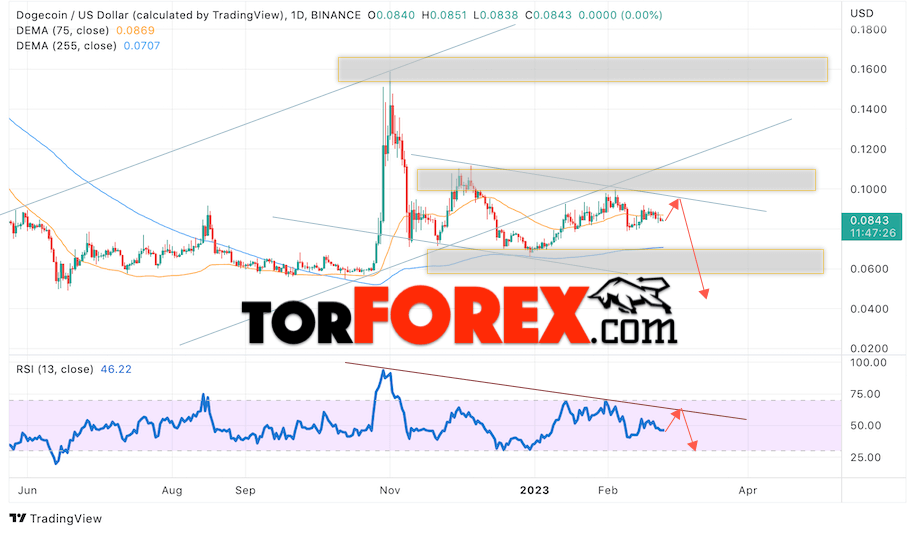 Дополнительным сигналом в пользу падения котировок DOGE/USD на текущей торговой неделе 27 февраля — 3 марта 2023 выступит тест нисходящей линии тренда на индикаторе относительной силы (RSI). Вторым сигналом станет отскок от верхней границы нисходящего канала. Отменой варианта снижения криптовалюты Dogecoin на следующей торговой неделе станет сильный рост цены и пробой области 0.1095. Это укажет на пробой области сопротивления и продолжение роста котировок DOGE/USD с целью выше уровня 0.1485. Подтверждением падению криптовалюты выступит пробой области поддержки и закрытие котировок ниже уровня 0.0585.