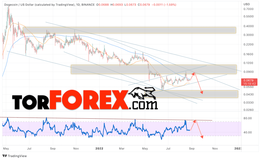 Дополнительным сигналом в пользу падения котировок DOGE/USD на текущей торговой неделе 29 августа — 2 сентября 2022 выступит тест нисходящей линии тренда на индикаторе относительной силы (RSI). Вторым сигналом станет отскок от верхней границы нисходящего канала. Отменой варианта падения криптовалюты Dogecoin на следующей торговой неделе станет сильный рост и пробой области 0.1275. Это укажет на пробой области сопротивления и продолжение роста котировок DOGE/USD с целью выше уровня 0.1865. Подтверждением падению криптовалюты выступит пробой области поддержки и закрытие котировок ниже уровня 0.0505, что укажет на пробой нижней границы бычьего канала коррекции.