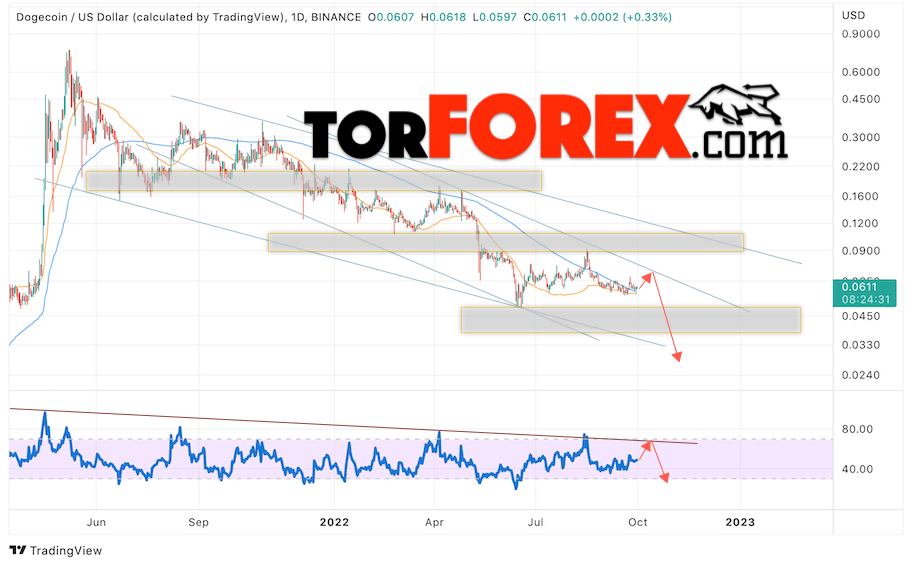 Дополнительным сигналом в пользу падения котировок DOGE/USD на текущей торговой неделе 3 — 7 октября 2022 выступит тест нисходящей линии тренда на индикаторе относительной силы (RSI). Вторым сигналом станет отскок от верхней границы нисходящего канала. Отменой варианта падения криптовалюты Dogecoin на следующей торговой неделе станет сильный рост и пробой области 0.1235. Это укажет на пробой области сопротивления и продолжение роста котировок DOGE/USD с целью выше уровня 0.1705. Подтверждением падению криптовалюты выступит пробой области поддержки и закрытие котировок ниже уровня 0.0435.
