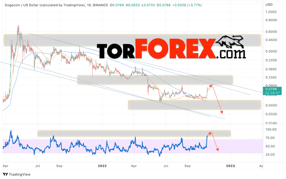 Дополнительным сигналом в пользу падения котировок DOGE/USD на текущей торговой неделе 31 октября — 4 ноября 2022 выступит тест нисходящей линии тренда на индикаторе относительной силы (RSI). Вторым сигналом станет отскок от верхней границы нисходящего канала. Отменой варианта падения криптовалюты Dogecoin на следующей торговой неделе станет сильный рост цены и пробой области 0.1005. Это укажет на пробой области сопротивления и продолжение роста котировок DOGE/USD с целью выше уровня 0.1465. Подтверждением падению криптовалюты выступит пробой области поддержки и закрытие котировок ниже уровня 0.0465.