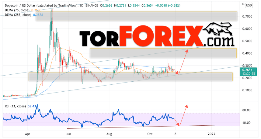 Дополнительным сигналом в пользу подъёма котировок DOGE/USD на текущей торговой неделе 8 — 12 ноября 2021 выступит тест линии поддержки на индикаторе относительной силы. Вторым сигналом станет отскок от нижней границы бычьего канала. Отменой варианта подъёма криптовалюты Dogecoin на следующей торговой неделе станет падение и пробой области 0.1675. Это укажет на пробой области поддержки и продолжение падения котировок DOGE/USD с целью ниже уровня 0.1105. Подтверждением подъёму криптовалюты выступит пробой области сопротивления и закрытие котировок выше уровня 0.4255, что укажет на пробой верхней границы бычьего канала, а это сильный сигнал к продолжению подъёма.