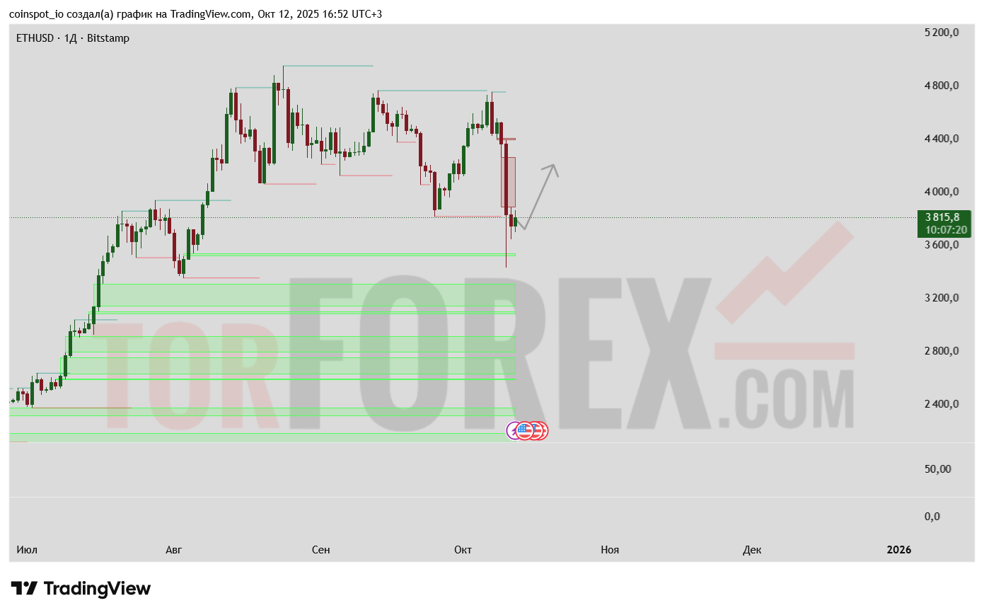 На графике выделяется значительная FVG зона в диапазоне 4200-4400, которая остается ключевым магнитным уровнем при дальнейшем росте. Текущее движение цены выше 3800 формирует более высокий минимум в структуре Pivot Points, что добавляет аргументов в пользу бычьего сценария.