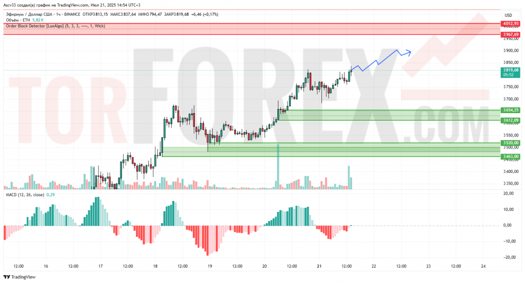 ETH/USD с высокой вероятностью продолжит движение к зоне 3 900–4 000 с возможной консолидацией ниже 4 012. Поддержка в районе 3 650 будет ключевой для сохранения восходящей структуры. Сценарий предпочтительный — продолжение роста к верхней границе сопротивления с потенциальным обновлением максимумов.