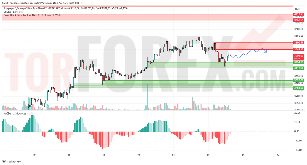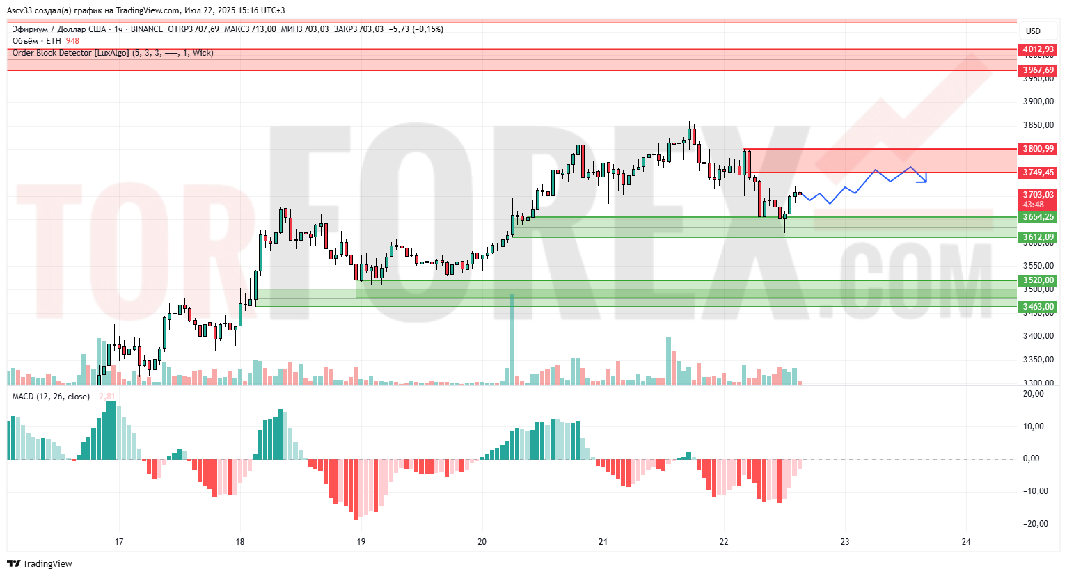 3650–3610 — зона, от которой покупатели уже демонстрировали активность. Ниже располагается более крупная поддержка в районе 3520–3460.