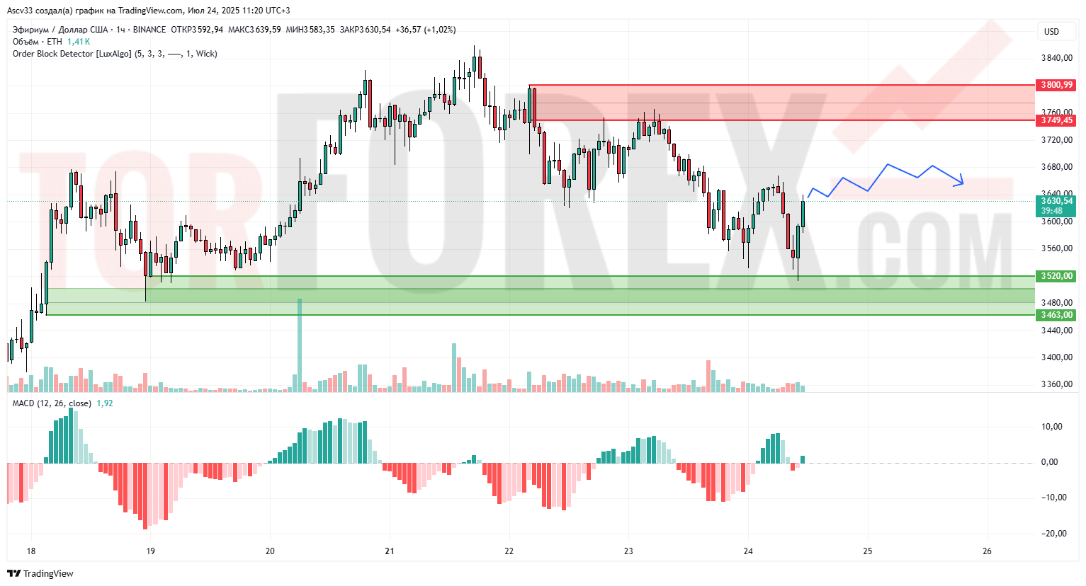 3520–3463 — основная зона спроса, от которой цена уже отскочила. Повторный её тест будет критически важен для быков.
