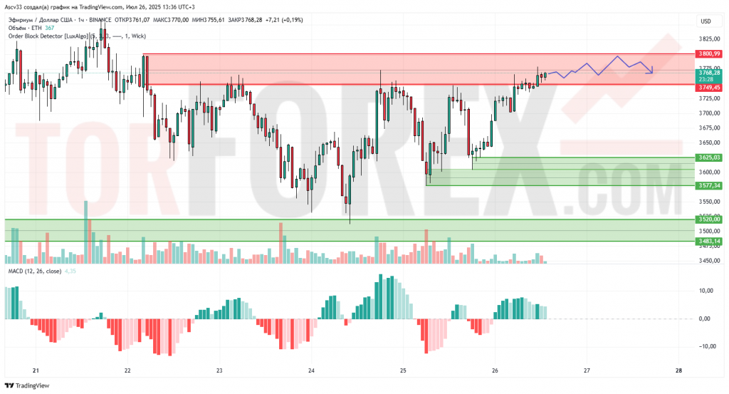 При успешном пробое и закреплении выше зоны сопротивления 3749.00 – 3800.99, пара ETH/USD имеет высокий потенциал для дальнейшего роста. Однако, в случае неудачного пробоя и отката, возможна коррекция к ближайшим зонам поддержки. Основным сценарием является продолжение восходящего движения с возможностью краткосрочных откатов для тестирования пробитых уровней или ближайших поддержек.