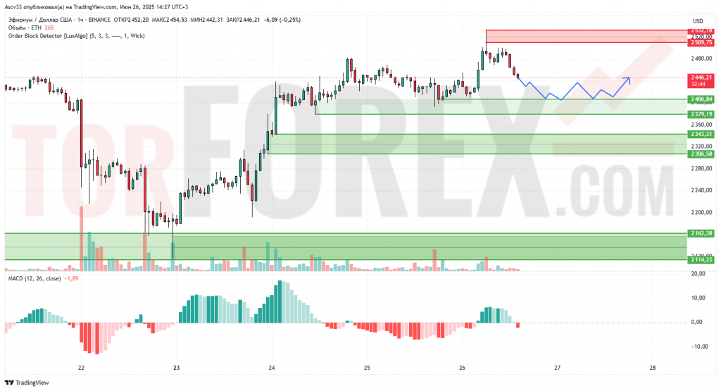Эфириум скорректировался от зоны сопротивления 2509,75–2532,18 после стремительного роста и сейчас торгуется в нисходящем локальном откате. На графике формируется структура коррекционного треугольника, при этом цена удерживается выше ключевых поддержек. Объёмы снижаются, что типично для консолидации.