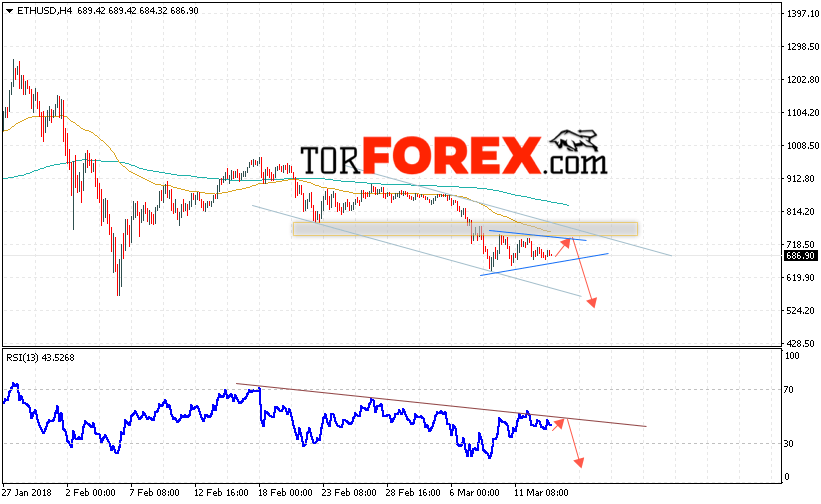 Таким образом, Ethereum прогноз и аналитика на 15 марта 2018 предполагает попытку теста уровня сопротивления вблизи области 720, откуда стоит ожидать отскок и продолжения падения в область ниже уровня 525, дополнительным сигналом в пользу падения Ethereum выступит тест нисходящей линии тренда на индикаторе относительной силы.