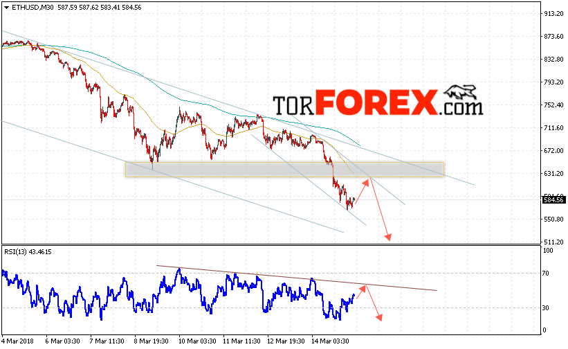 Таким образом, Ethereum прогноз и аналитика на 16 марта 2018 предполагает попытку теста уровня сопротивления вблизи области 625, откуда стоит ожидать отскок и продолжения падения в область ниже уровня 500, дополнительным сигналом в пользу падения Ethereum выступит тест нисходящей линии тренда на индикаторе относительной силы.