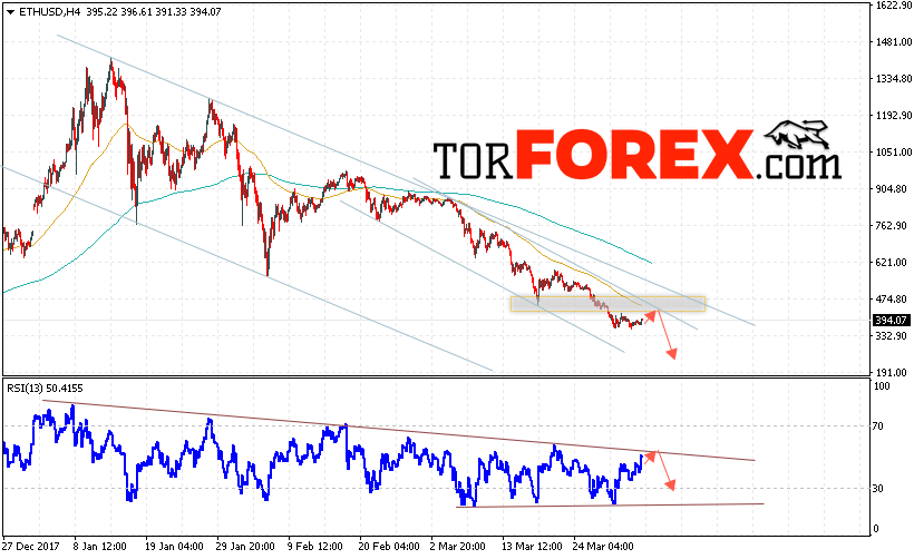 Таким образом, Ethereum прогноз и аналитика на 4 апреля 2018 предполагает попытку теста уровня сопротивления вблизи области 440, откуда стоит ожидать отскок и продолжения падения в область ниже уровня 240, дополнительным сигналом в пользу падения Ethereum выступит тест нисходящей линии тренда на индикаторе относительной силы.
