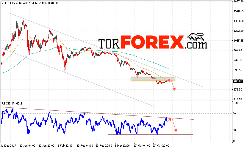 Таким образом, Ethereum прогноз и аналитика на 5 апреля 2018 предполагает попытку теста уровня сопротивления вблизи области 430, откуда стоит ожидать отскок и продолжения падения в область ниже уровня 260, дополнительным сигналом в пользу падения Ethereum выступит тест нисходящей линии тренда на индикаторе относительной силы.