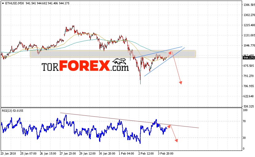 Таким образом, Ethereum прогноз и аналитика на 5 февраля 2018 предполагает попытку теста уровня 965, откуда стоит ожидать отскок и продолжения падения в область ниже уровня 710, дополнительным сигналом в пользу падения Ethereum выступит тест линии сопротивления на индикаторе относительной силы.