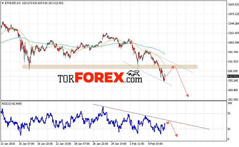Котировки Ethereum ETH/USD торгуются на уровне 612 и продолжают движение в рамках нисходящей тенденции. На данный момент стоит ожидать попытку теста уровня сопротивления вблизи области 740. Откуда вновь стоит ожидать отскок и продолжение падения курса Ethereum с целью ниже уровня 350.