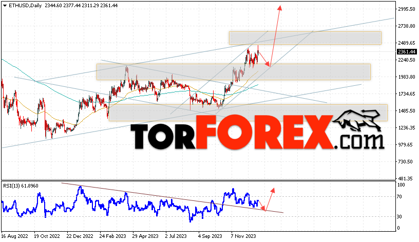 Дополнительным сигналом в пользу падения котировок ETH/USD на текущей торговой неделе 1 — 5 января 2024 выступит тест линии поддержки на индикаторе относительной силы. Вторым сигналом станет отскок от нижней границы бычьего канала. Отменой варианта роста стоимости криптовалюты на текущей торговой неделе станет падение и пробой уровня 1865. Это укажет на пробой области сопротивления и продолжение роста котировок ETH/USD с потенциальной целью выше уровня 1475. Подтверждением росту криптовалюты Ethereum выступит пробой области сопротивления и закрытие котировок выше уровня 2805, что укажет на пробой верхней границы бычьего канала, а это сигнал к росту на ширину канала.