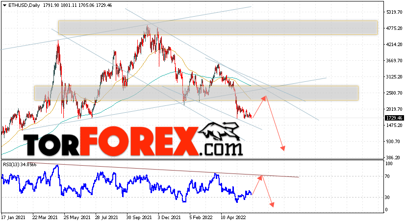 Дополнительным сигналом в пользу падения котировок ETH/USD на текущей торговой неделе 13 — 17 июня 2022 выступит тест сопротивления тренда на индикаторе относительной силы. Вторым сигналом станет отскок от верхней границы медвежьего канала. Отменой варианта падения стоимости криптовалюты на текущей торговой неделе станет сильный рост и пробой уровня 2855. Это укажет на пробой области сопротивления и продолжение подъёма котировок ETH/USD с потенциальной целью выше уровня 3505. Подтверждением падению криптовалюты Ethereum выступит пробой области поддержки и закрытие котировок ниже уровня 1355.