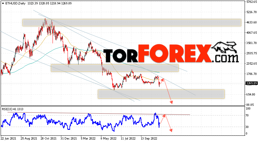 Дополнительным сигналом в пользу падения котировок ETH/USD на текущей торговой неделе 14 — 18 ноября 2022 выступит тест сопротивления тренда на индикаторе относительной силы. Вторым сигналом станет отскок от верхней границы нисходящего канала. Отменой варианта падения стоимости криптовалюты на текущей торговой неделе станет сильный рост и пробой уровня 1875. Это укажет на пробой области сопротивления и продолжение подъёма котировок ETH/USD с потенциальной целью выше уровня 2465. Подтверждением падению криптовалюты Ethereum выступит пробой области поддержки и закрытие котировок ниже уровня 965.