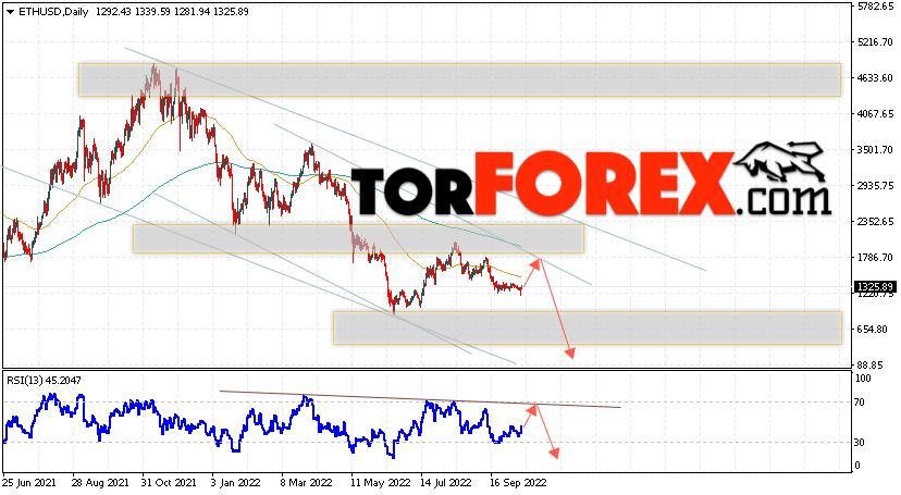 Дополнительным сигналом в пользу падения котировок ETH/USD на текущей торговой неделе 17 — 21 октября 2022 выступит тест сопротивления тренда на индикаторе относительной силы. Вторым сигналом станет отскок от верхней границы нисходящего канала. Отменой варианта падения стоимости криптовалюты на текущей торговой неделе станет сильный рост и пробой уровня 2305. Это укажет на пробой области сопротивления и продолжение подъёма котировок ETH/USD с потенциальной целью выше уровня 2765. Подтверждением падению криптовалюты Ethereum выступит пробой области поддержки и закрытие котировок ниже уровня 1065.
