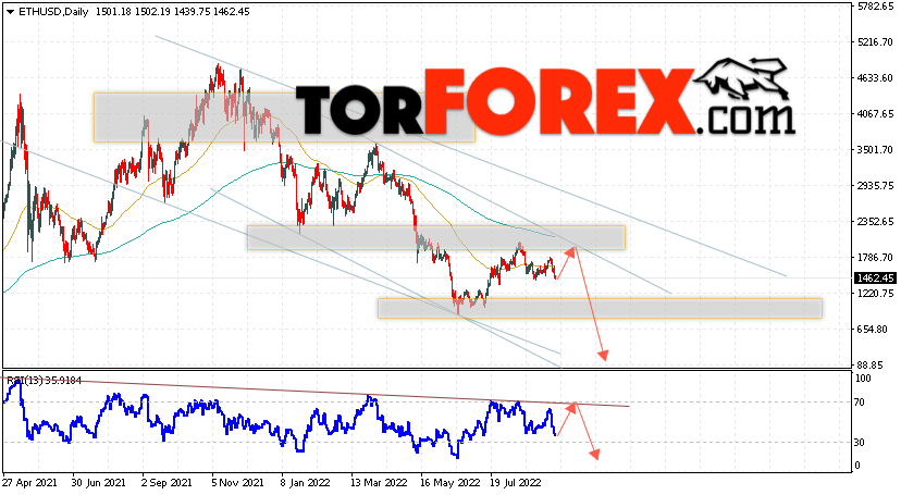 Дополнительным сигналом в пользу падения котировок ETH/USD на текущей торговой неделе 19 — 23 сентября 2022 выступит тест сопротивления тренда на индикаторе относительной силы. Вторым сигналом станет отскок от верхней границы медвежьего канала. Отменой варианта падения стоимости криптовалюты на текущей торговой неделе станет сильный рост и пробой уровня 2375. Это укажет на пробой области сопротивления и продолжение подъёма котировок ETH/USD с потенциальной целью выше уровня 2725. Подтверждением падению криптовалюты Ethereum выступит пробой области поддержки и закрытие котировок ниже уровня 1005.