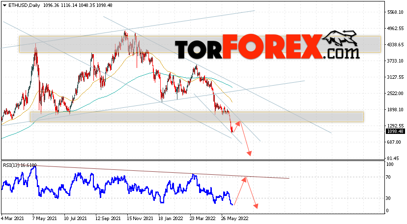 Дополнительным сигналом в пользу падения котировок ETH/USD на текущей торговой неделе 20 — 24 июня 2022 выступит тест сопротивления тренда на индикаторе относительной силы. Вторым сигналом станет отскок от верхней границы медвежьего канала. Отменой варианта падения стоимости криптовалюты на текущей торговой неделе станет сильный рост и пробой уровня 1905. Это укажет на пробой области сопротивления и продолжение подъёма котировок ETH/USD с потенциальной целью выше уровня 2455. Подтверждением падению криптовалюты Ethereum выступит пробой области поддержки и закрытие котировок ниже уровня 805.