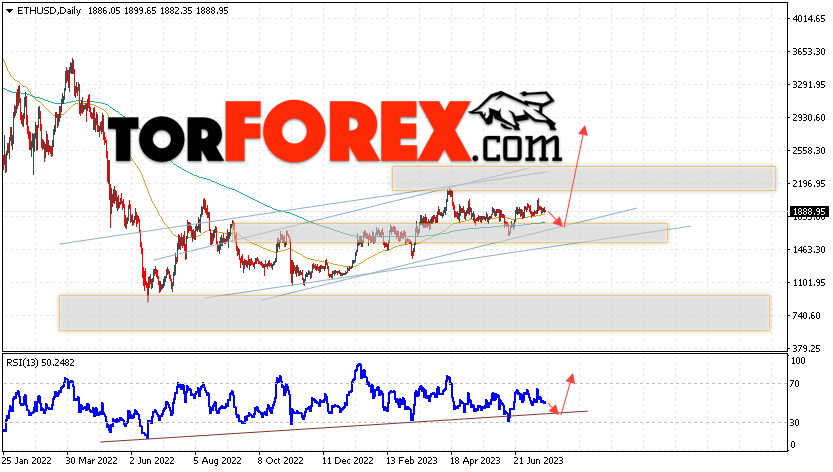 Дополнительным сигналом в пользу роста котировок ETH/USD на текущей торговой неделе 24 — 28 июля 2023 выступит тест бычьей линии поддержки на индикаторе относительной силы. Вторым сигналом станет отскок от нижней границы бычьего канала. Отменой варианта роста стоимости криптовалюты на текущей торговой неделе станет падение и пробой уровня 1445. Это укажет на пробой области поддержки и продолжение падения котировок ETH/USD с потенциальной целью ниже уровня 1185. Подтверждением росту криптовалюты Ethereum выступит пробой области сопротивления и закрытие котировок выше уровня 2205.