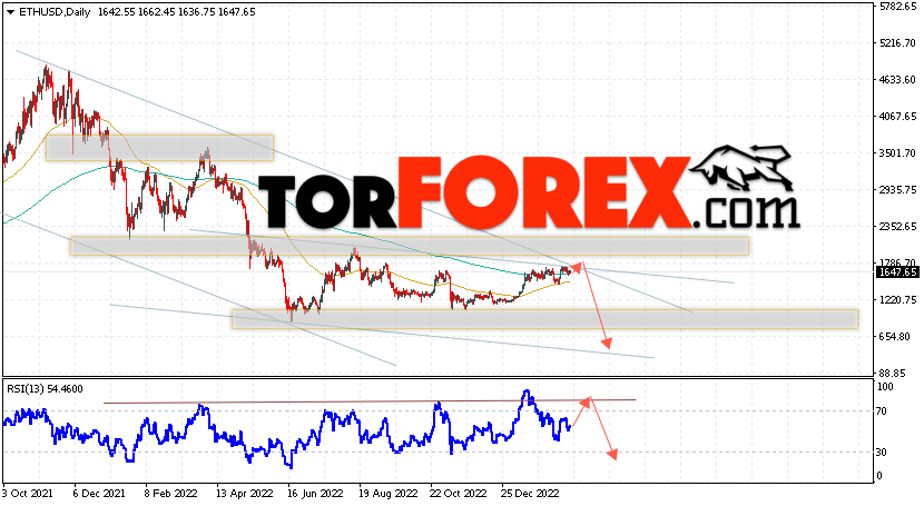 Дополнительным сигналом в пользу падения котировок ETH/USD на текущей торговой неделе 27 февраля — 3 марта 2023 выступит тест сопротивления тренда на индикаторе относительной силы. Вторым сигналом станет отскок от верхней границы нисходящего канала. Отменой варианта падения стоимости криптовалюты на текущей торговой неделе станет сильный рост и пробой уровня 2145. Это укажет на пробой области сопротивления и продолжение подъёма котировок ETH/USD с потенциальной целью выше уровня 2685. Подтверждением падению криптовалюты Ethereum выступит пробой области поддержки и закрытие котировок ниже уровня 1365, что укажет на завершение формирования разворотной модели ”Двойная вершина”.